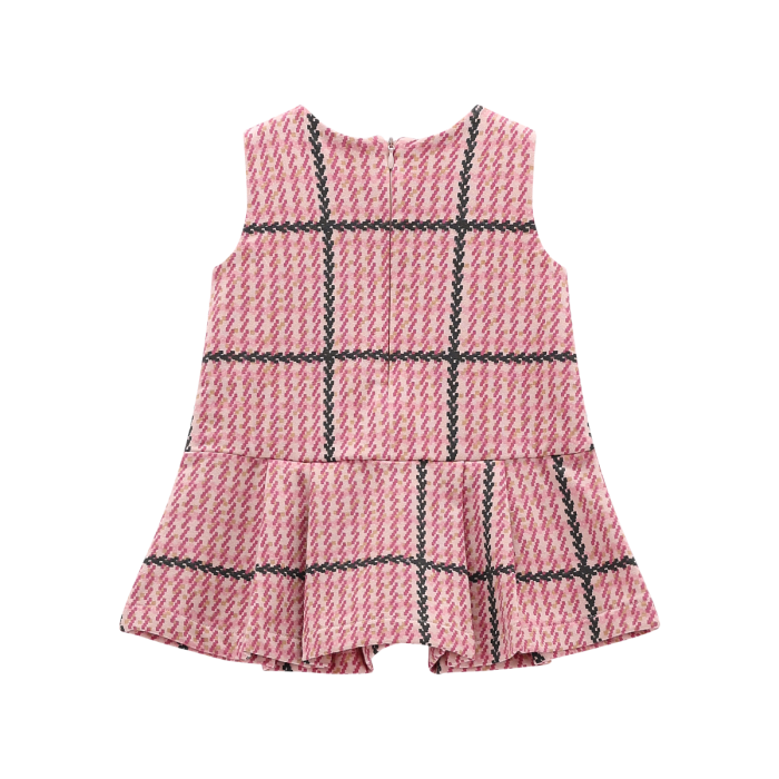 Abito senza maniche realizzato in felpa stretch per bambina, con motivo a quadri allover. Le plissettature frontali e le finte tasche applicate in vita danno movimento al capo. Apertura sul retro.