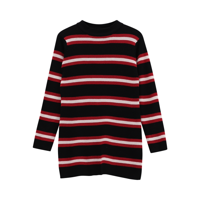 Abito girocollo a maniche lunghe per ragazza, realizzato in tricot a righe con effetto costina. Ideale sia per le occasioni speciali che per un contesto più casual.