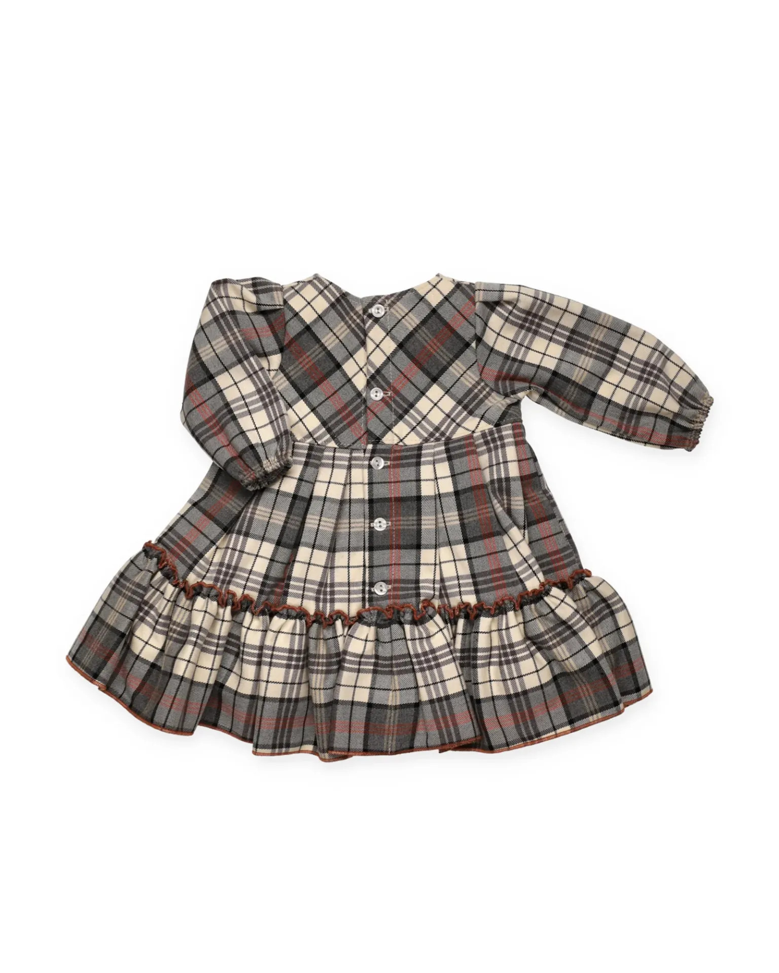 Abito a quadri nei toni dell'écru, del grigio e del beige. Caratterizzato da un corpetto strutturato, decorato con due pompon lavorati a maglia abbinati e un volant sull'orlo.