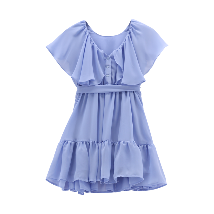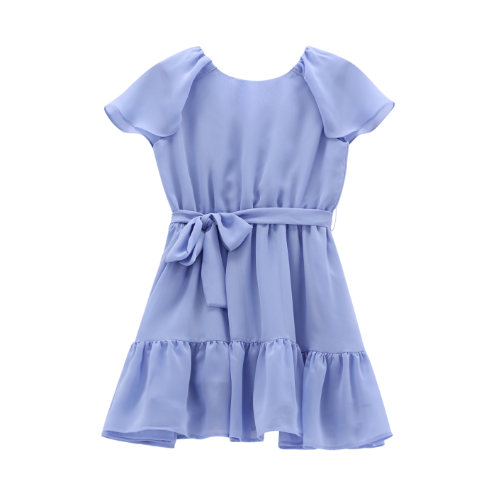 Abito con vezzose maniche ad aletta per bambina, realizzato in creponne tinta unita. Molto curati i dettagli, come la cintura in tono colore, la balza inferiore della gonna e la scollatura a V sul retro, con graziosi volant e bottoni in tono colore. Perfetto per le cerimonie della primavera/estate.