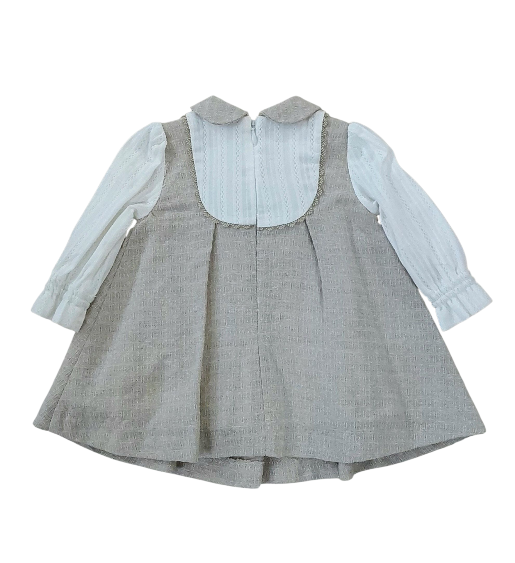 Raffinato abito sui toni del beige con effetto camicia sul davanti e nelle maniche con pratica zip di chiusura sul dietro.