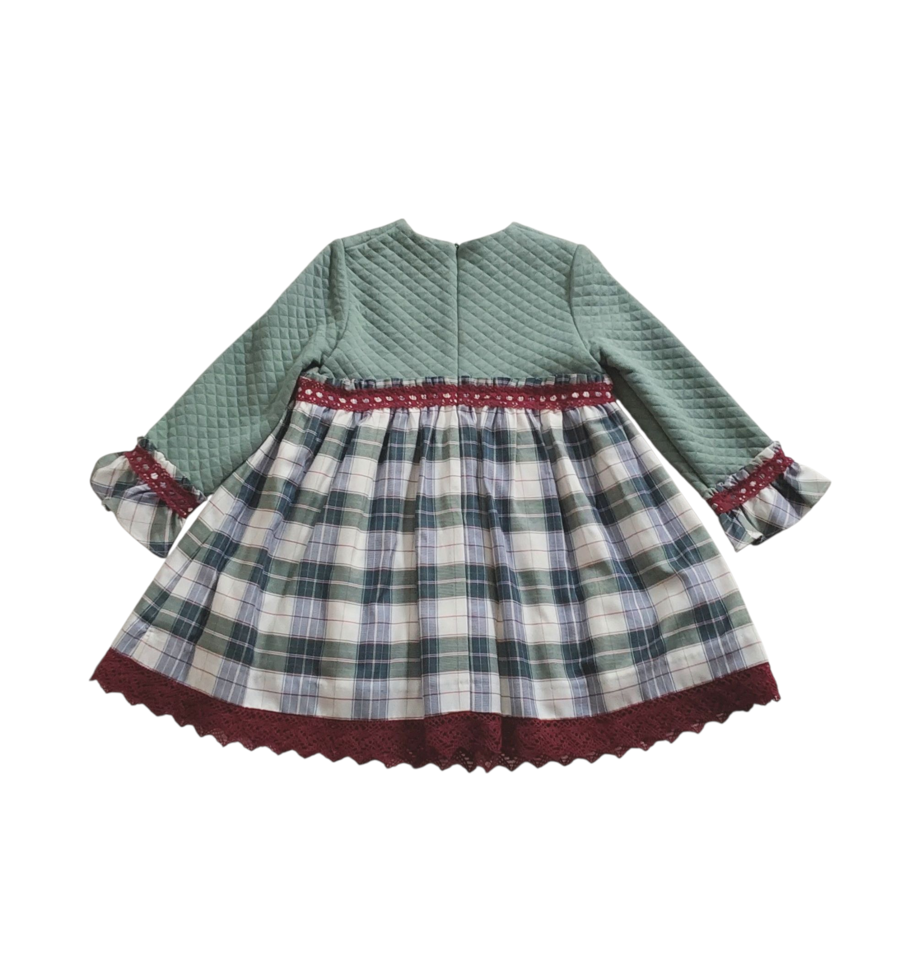 Elegante abito con corpetto trapuntato verde salvia, gonna scozzese rifinita con  merletto di cotone.