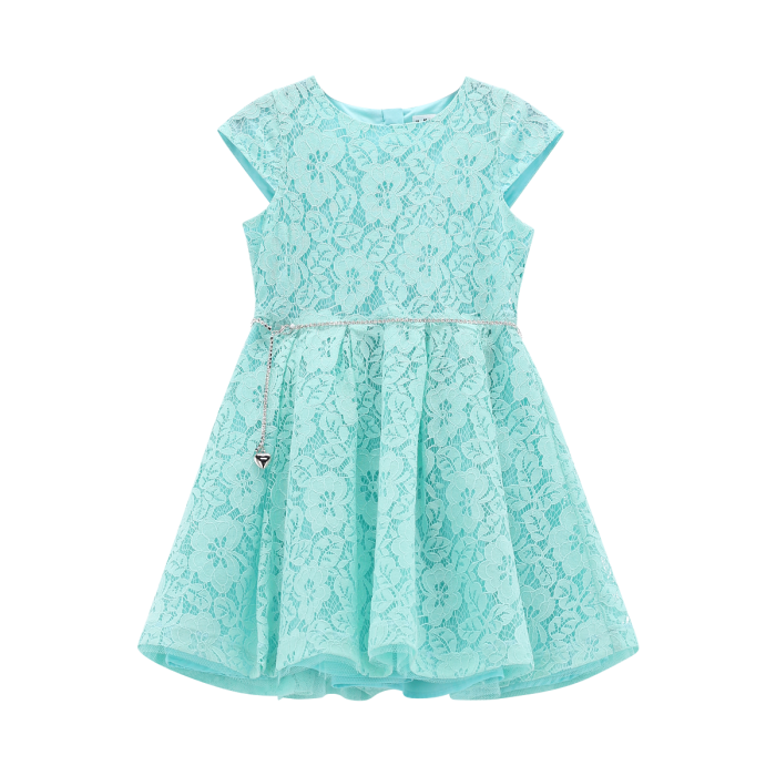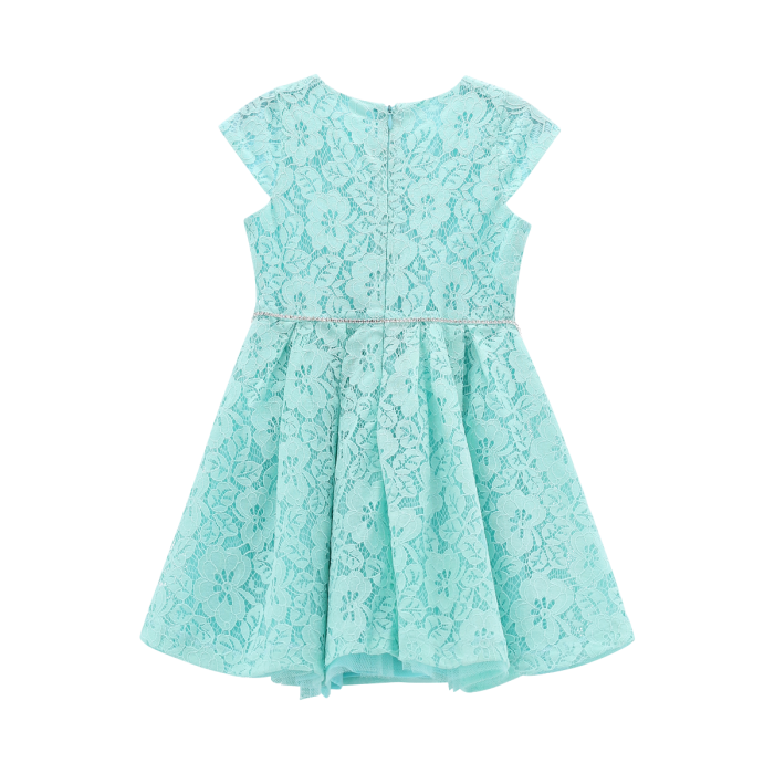 Abito girocollo a maniche corte per ragazza, realizzato in pizzo e doppiato in tulle tinta unita. Molto vezzose la gonna a pieghe e la cintura luccicante. Perfetto per le cerimonie della primavera/estate.