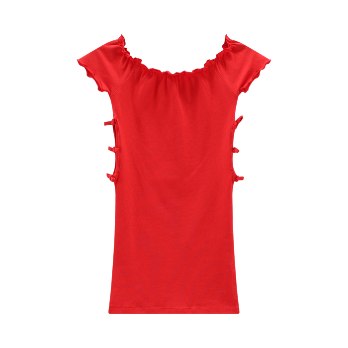 Abito estivo per ragazza, realizzato in jersey stretch tinta unita. Giro manica e scollo arricciati, vezzose aperture laterali con nodino. Perfetto per le giornate estive!