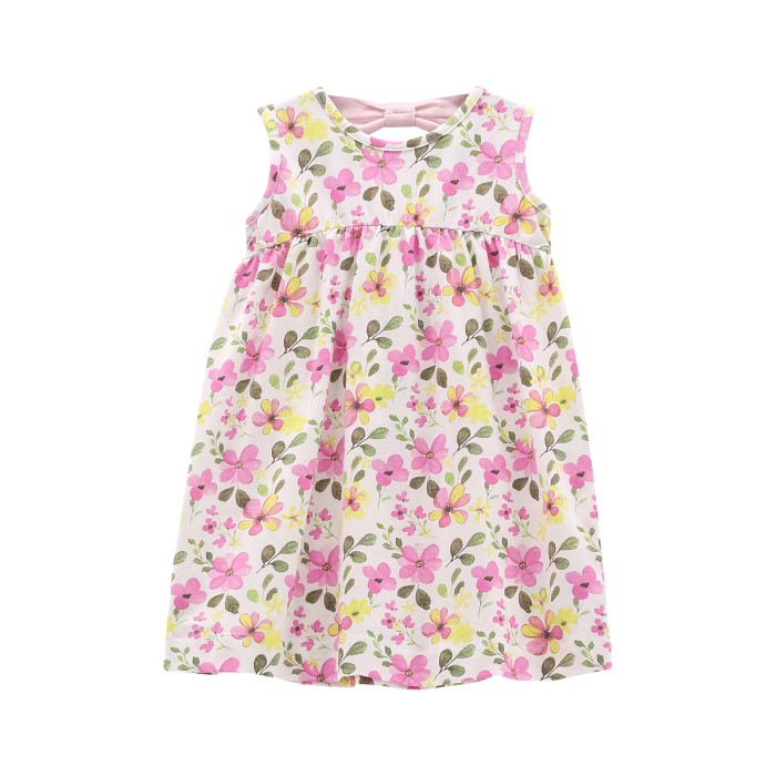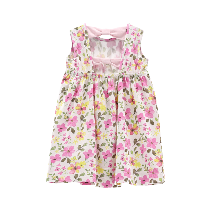 Abito senza maniche per neonata realizzato con vezzosa fantasia floreale allover nei toni pastello. I fiocchi applicati sulla schiena aggiungono un tocco femminile e delicato. Perfetto per le feste primaverili!