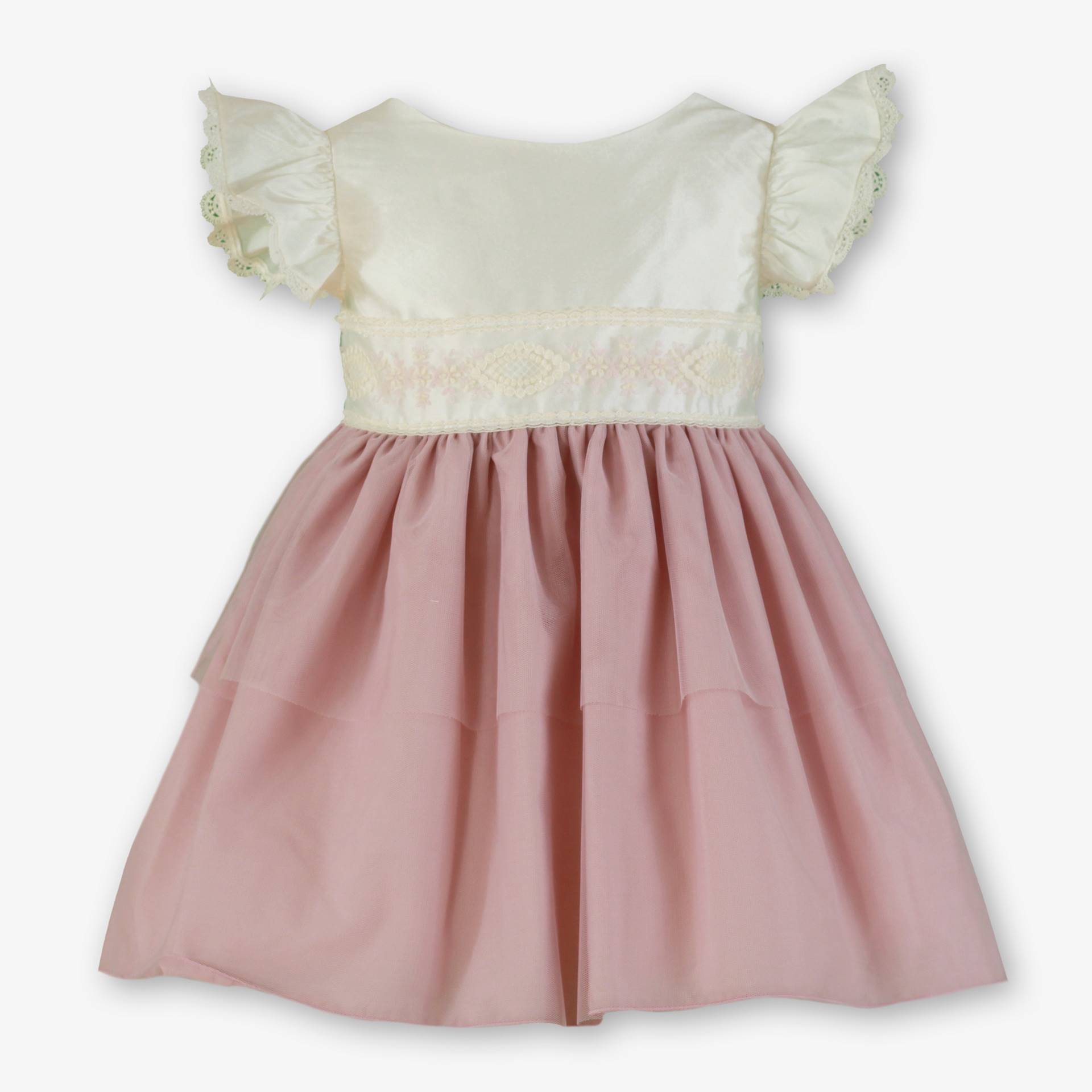 Abito con corpetto in shantung ricamato e gonna rosa con tulle, un grande fiocco sulla parte posteriore lo arricchisce e completa. Elegante con sottogonna