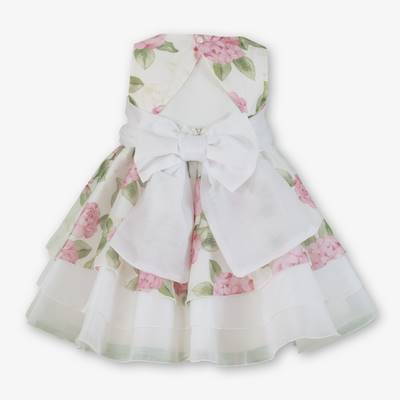 Delizioso abito in misto lino, con delicata fantasia floreale sui toni del rosa su fondo bianco ,un  grande fiocco completa la parte posteriore. Elegante con sottogonna