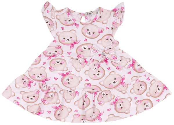 Grazioso abito per bambina in morbido cotone elasticizzato, perfetto per un look dolce e confortevole. Il modello si distingue per le romantiche spalline a volant e una tenera stampa all-over con orsetti. Impreziosito da un fiocchetto in vita e una pratica chiusura sul retro.