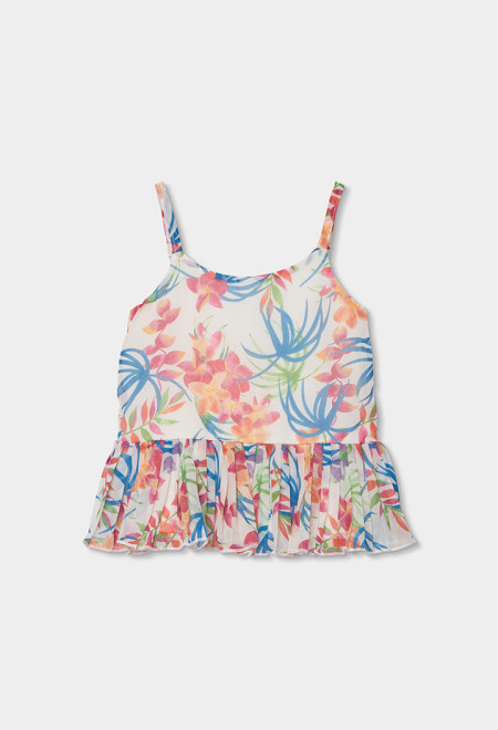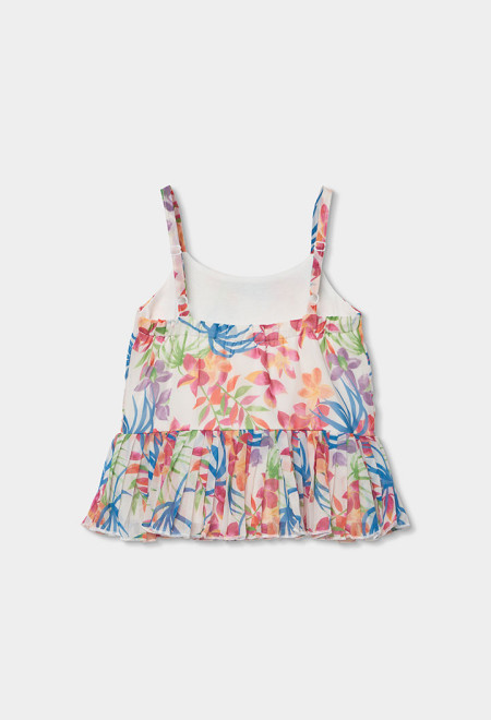Blusa di chiffon stampato. Il suo materiale leggero offre comfort e freschezza. Il design presenta una vivace stampa floreale in toni rosa, blu e verde, perfetta per un look allegro ed estivo. L'orlo del capo è formato da un volant con lo stesso chiffon plissettato. Le spalline la rendono ideale per i giorni caldi, e la sua ampiezza offre un tocco romantico. È perfetta da abbinare a gonne o pantaloni leggeri, aggiungendo un tocco chic e colorato allo stile di ogni bambina.