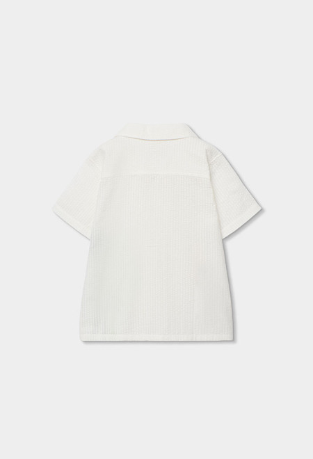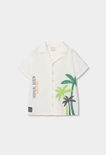Camicia di popeline per bambino, ideale per un look fresco ed estivo. Il suo tessuto leggero seersucker è perfetto per i giorni più caldi. Di colore bianco, presenta un design con palme e lettere che conferisce un tocco tropicale e moderno. Ha un colletto classico e chiusura a bottoni. E' un capo versatile che si abbina facilmente con pantaloncini o jeans per uno stile rilassato e alla moda.