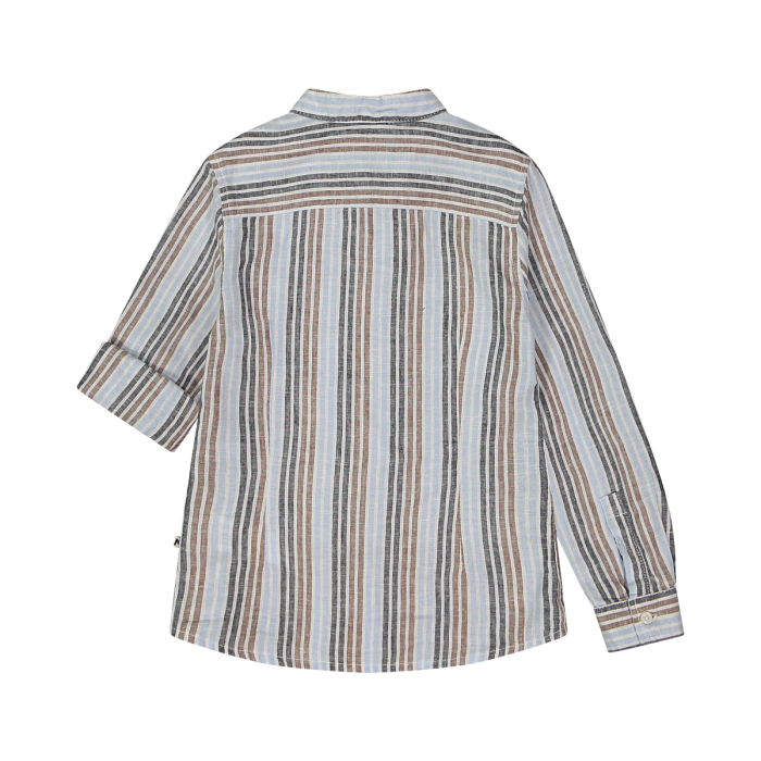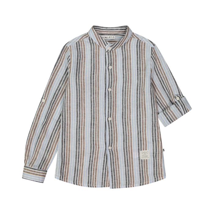 Camicia a manica lunga con collo alla coreana per bambino, realizzata in tessuto misto lino con disegno a bastoncino nei toni del marrone e azzurro. Bottoni in tono. Disponibile in diversi colori. Ideale sia per un look elegante che per un abbinamento più casual.