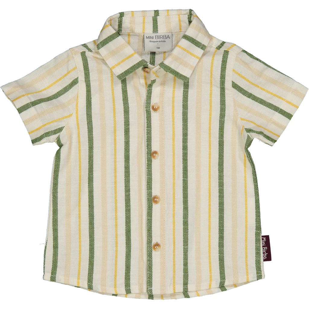 CAMICIA IN MISTO LINO FANTASIA RIGATA. BOTTONCINI EFFETO FINTO OSSO PER APERTURA FRONTALE. CON ETICHETTA BANDIERINA PERSONALIZZATA INSERITA NEL FIANCO.