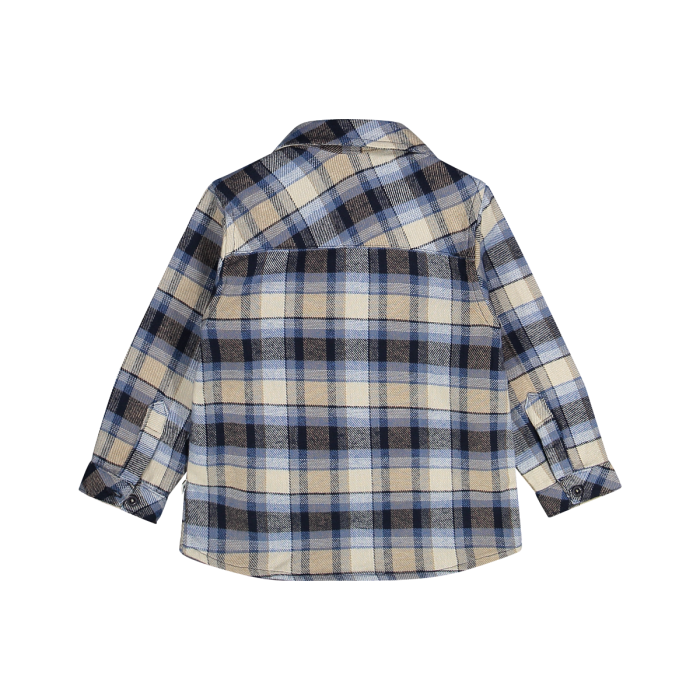 Camicia per bambino realizzata in morbida e calda flanella nei toni degli azzurri e dei beige. Bottoni con logo Melby in contrasto di colore blu. Pratica e confortevole, da abbinare ai pantaloni cargo della collezione nelle stesse tonalità.