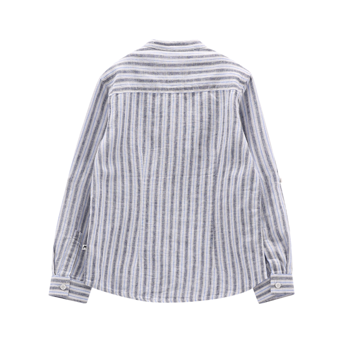 Camicia taglio coreano per ragazzo, realizzata in misto lino/cotone a righe. Maniche ripiegabili con fettuccina, per rendere il capo più sbarazzino. Perfetta per le cerimonie nella stagione calda!