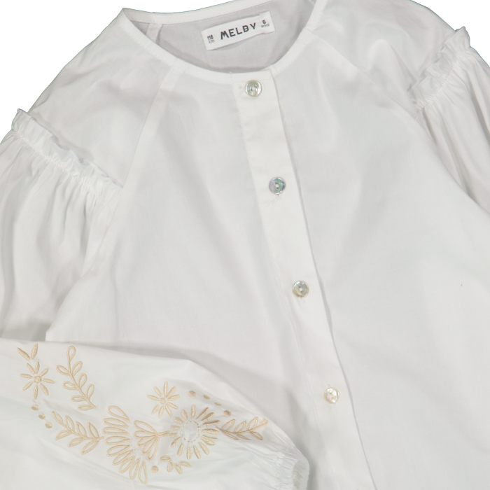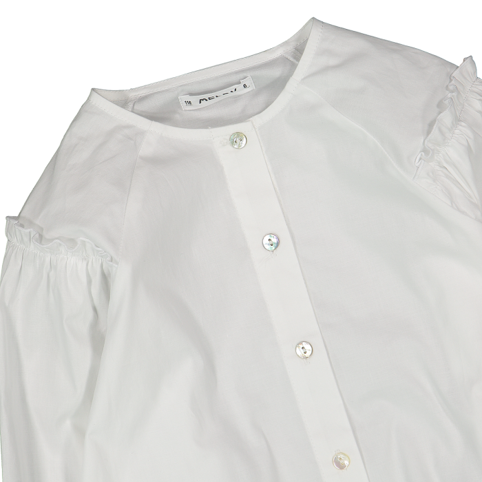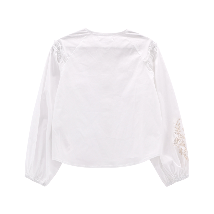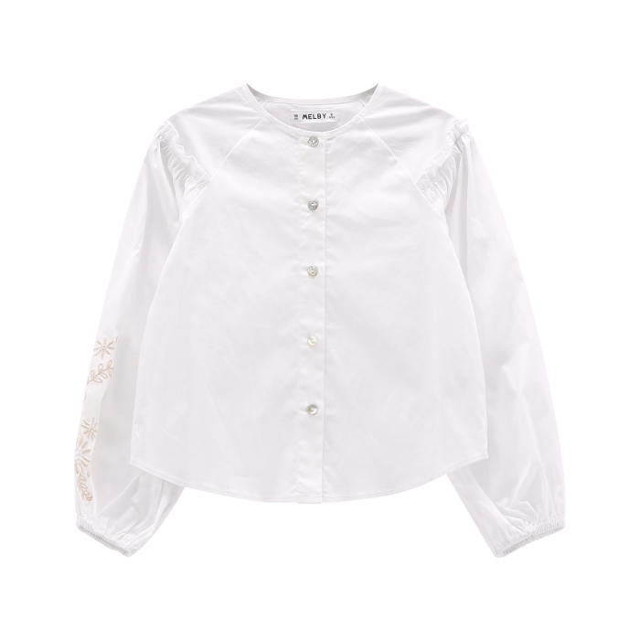 Camicia girocollo a maniche lunghe per ragazza, dal taglio ampio e realizzata in popeline tinta unita. Molto curati i dettagli: le rouches applicate sulle spalle, i polsini arricciati e il ricamo floreale sulla manica. Femminile e fresca, perfetta per le cerimonie primaverili!