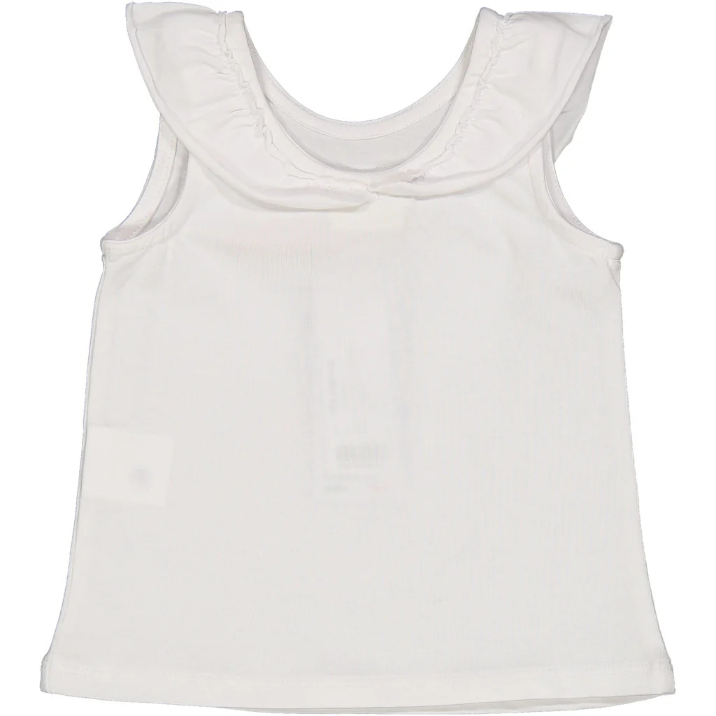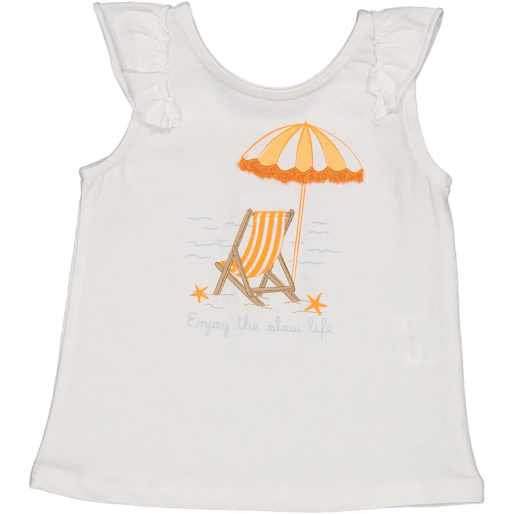 CANOTTA IN JERSEY DI COTONE STRETCH CON DETTAGLIO VOULANT. STAMPA BEACH CON FRANGE 3D SUL DAVANTI.