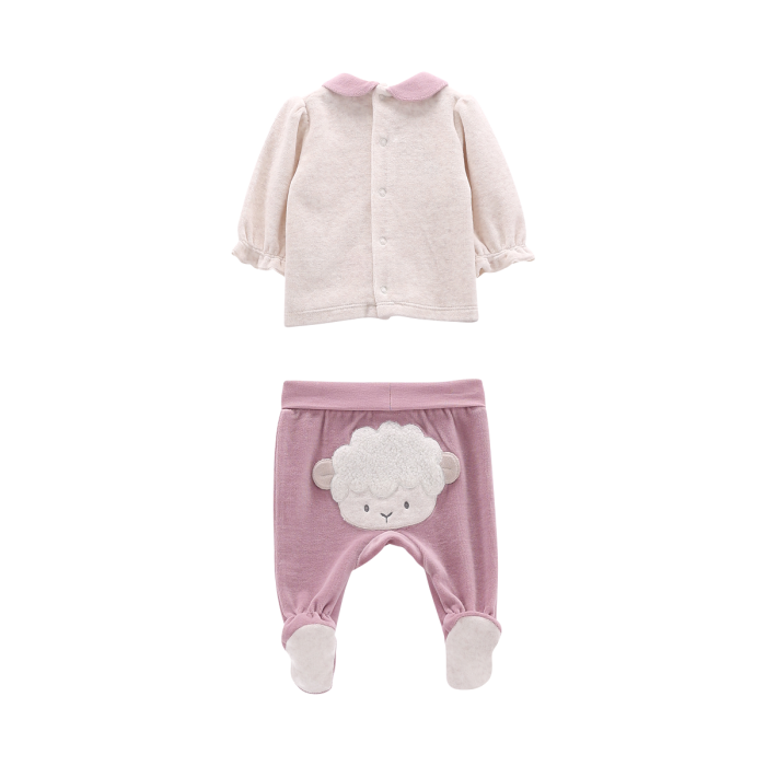 Completo clinica per neonata realizzato in ciniglia e composto da un pantalone con piede e da una maglia a maniche lunghe con colletto bebè. Vezzosi polsini con arricciatura, tenera stampa frontale. Pratica apertura sul retro con bottoncini, vita del pantalone elasticiata.