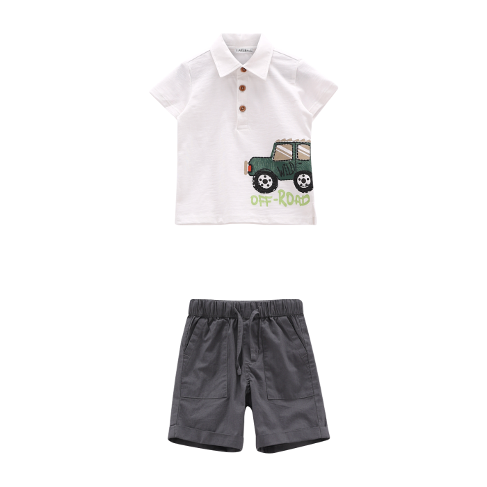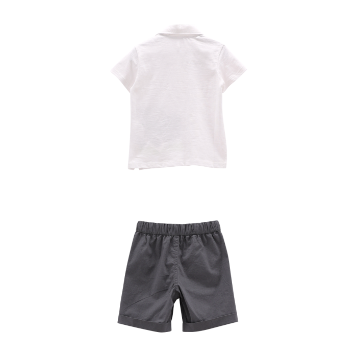 Completo 2 pezzi per neonato, composto da shorts in popeline tinta unita e da una polo in jersey malfilé. La simpatica stampa sul lato frontale riprende il tono colore del pantaloncino. Un look perfetto per la scuola!
