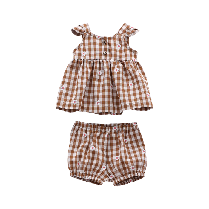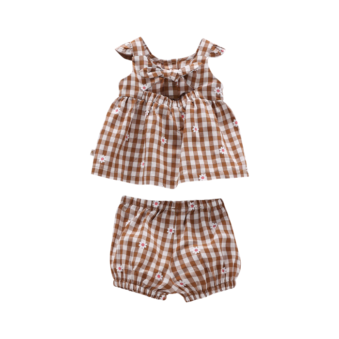 Completo per neonata realizzato in fantasia allover a quadretti e fiori e composto da un abitino smanicato e da un paio di culottes. Molto vezzosi i dettagli come le ruches sulle spalline e il fiocco applicato sull'apertura posteriore. Vezzoso e primaverile, perfetto per le occasioni speciali!