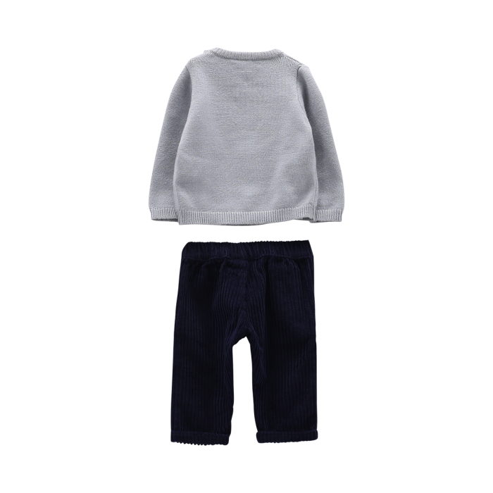 Completo per neonato composto da maglia tricot e pantalone cargo in velluto a coste. Lavorazione in costina su collo, polsi e fondo maglia; tenere decorazione frontale e apertura con bottoncini su spalla. Pantalone con tasconi cargo e vita elasticata