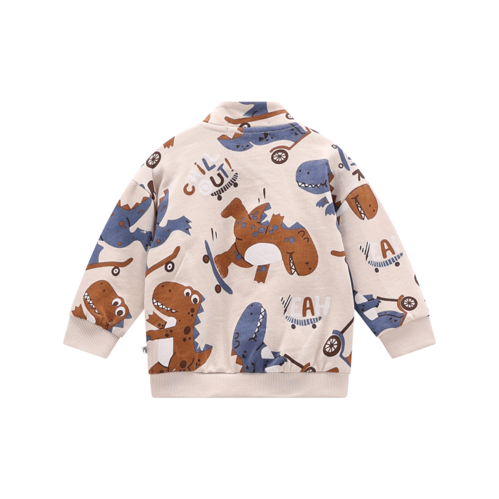Felpa full-zip per bambino, realizzata in felpa invernale con simpatica stampa allover a tema dinosauri e taschino applicato frontalmente. Lavorazione in costina su polsi.