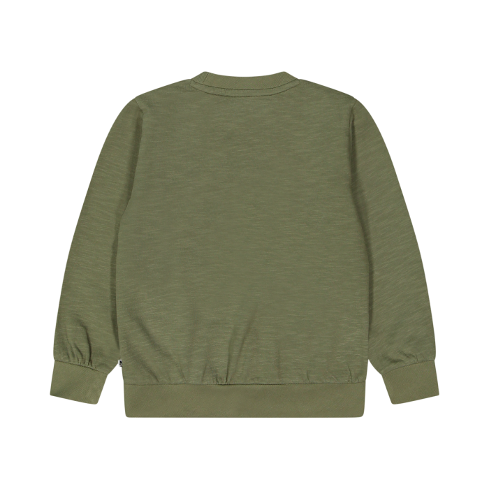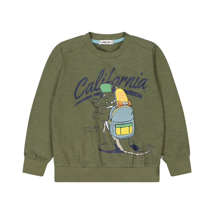 Maglia girocollo in felpa di cotone nei toni del verde oliva. Fondi, collo e polsi con lavorazione a costine. Giocosa grafica sul lato frontale di un coccodrillo con lo zaino sulle spalle.