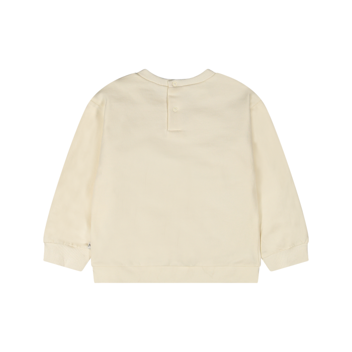 Maglia a maniche lunghe per bambina, realizzata in felpa di cotone nei toni avorio; le maniche lunghe leggermente a palloncino, gli spacchetti laterali sul fondo e la lavorazione in costina su collo e polsi aggiungono un tocco di femminilità. Sul lato frontale, una tenera stampa di Cip e Cop.