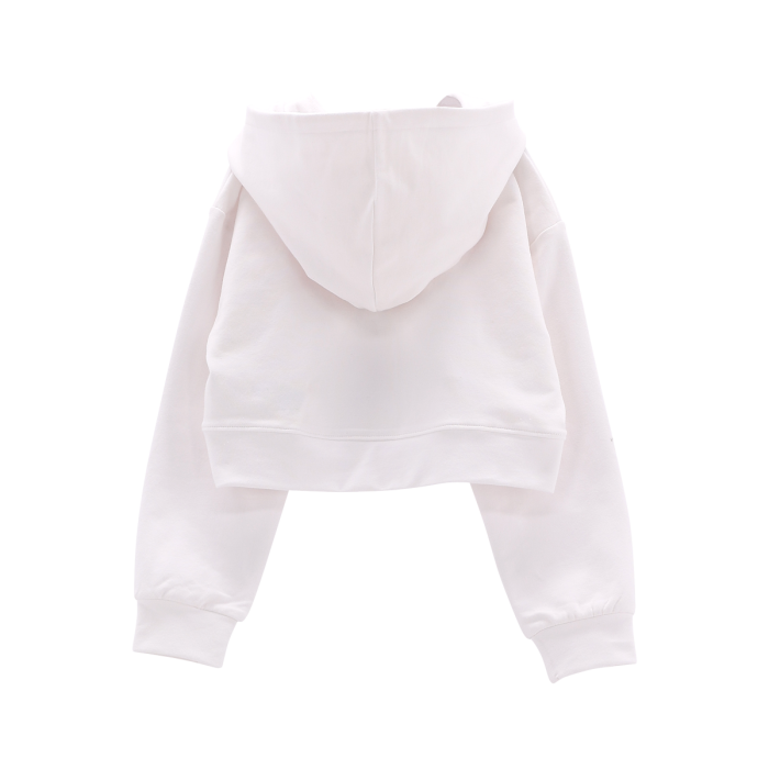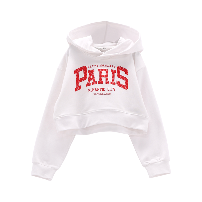 Felpa con cappuccio dal taglio crop per ragazza, realizzata in felpa stretch tinta unita. Maxi stampa con dettagli luccicanti sul lato frontale. Perfetta per il tempo libero!