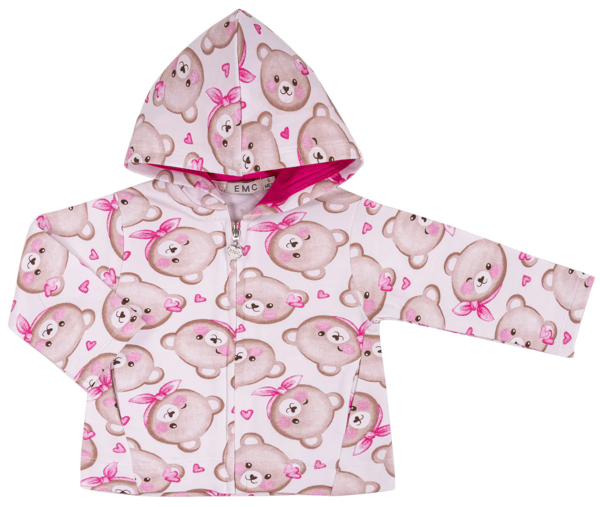 Confortevole giacca con cappuccio per bambina, realizzata in morbido cotone elasticizzato per garantire libertà di movimento. Il capo si distingue per una delicata fantasia floreale all-over e una pratica apertura frontale con zip. Il design è rifinito da un romantico volant arricciato sul fondo e comodi polsini elastici.