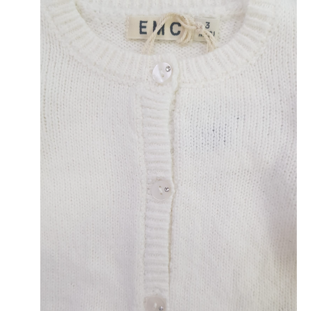 MORBIDO CARDIGAN COLOR BIANCO LATTE CON LAVORAIONE SULLA PARTE BASSA,  BOTTONCINI CON PUNTO LUCE CHE LO IMPREZIOSISCONO .
