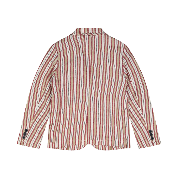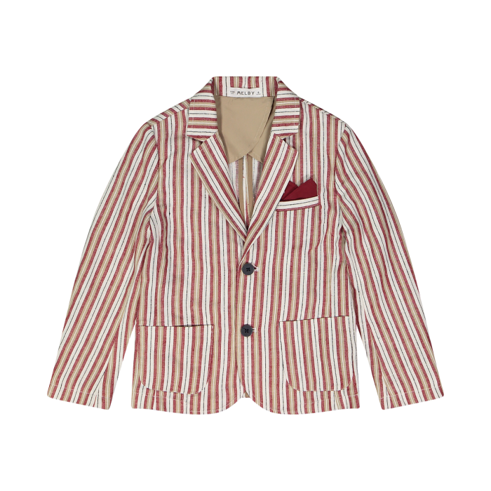 Giacca sfoderata due bottoni, in tessuto rigato misto cotone/lino nei colori del corda, bordeaux e blu. Capo ideale per le occasioni speciali o per eventi informali. Fazzoletto da taschino removibile. Da abbinare ai pantaloni realizzati con gli stessi colori e alle t-shirt o camicette della collezione per completare il look.