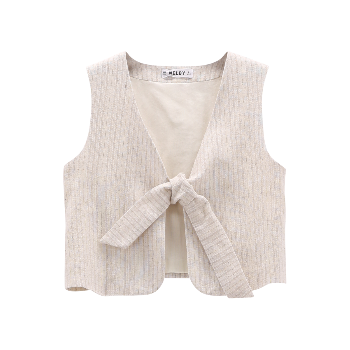 Gilet per ragazza, realizzato in lino con raffinato motivo a righe. Molto vezzoso il nodo frontale. Perfetto da abbinare alle camicie in collezione!
