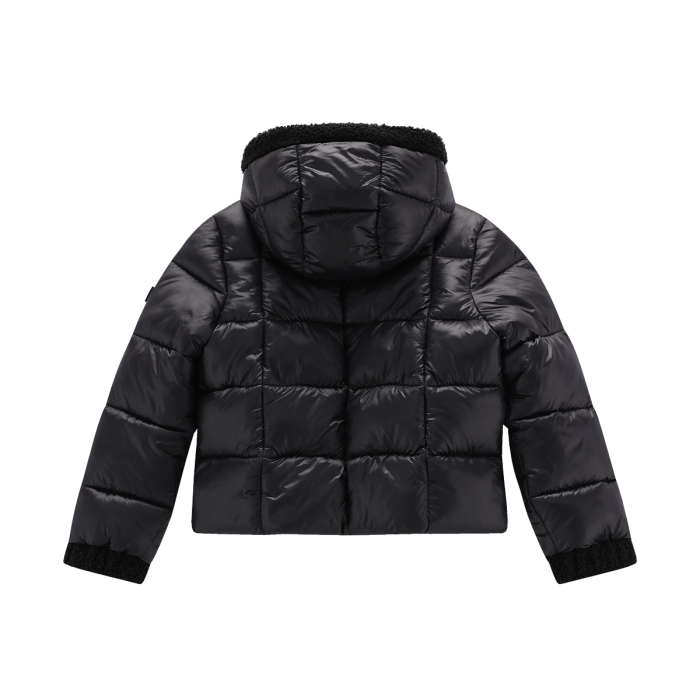 Giubbotto imbottito full-zip con cappuccio per ragazza, con dettagli in pelliccetta sintetica tono su tono. Tiretto e logo in contrasto colore.