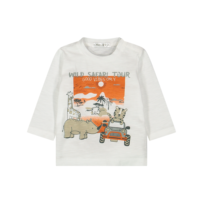 T-shirt a manica lunga in jersey 100% cotone con simpatica stampa di animali della savana sul davanti. Vestibilità regular e apertura con pratici bottoncini a pressione sulla spalla.