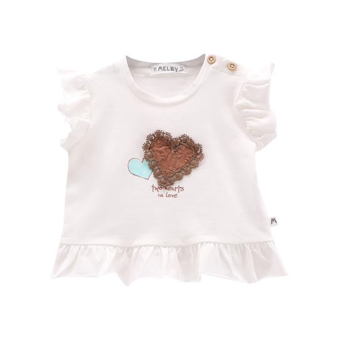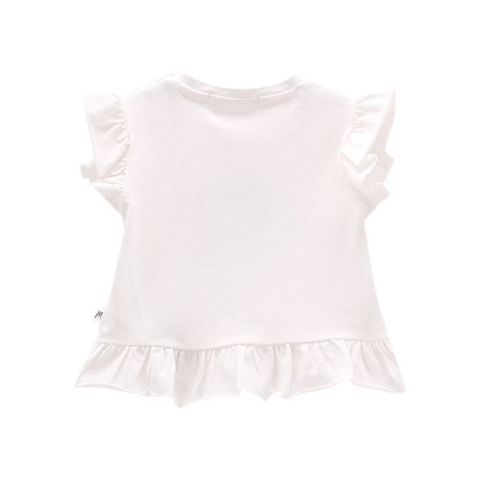 T-shirt girocollo per neonata, realizzata in jersey stretch tinta unita con maniche ad aletta e tenera stampa frontale. Molto vezzosa la ruche sul fondo maglia. Pratici bottoncini sulla spalla.