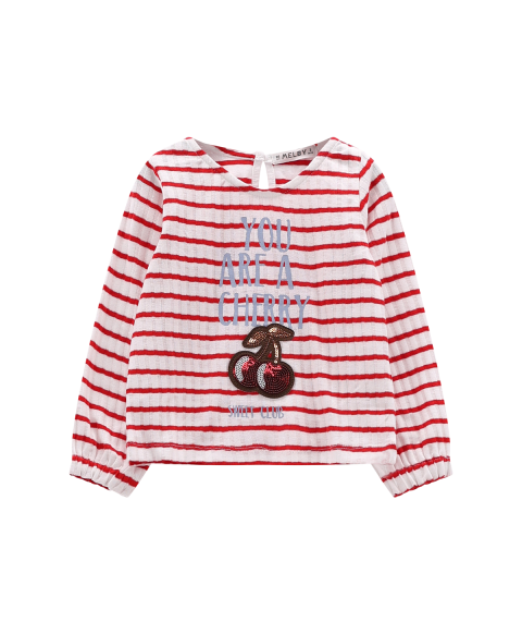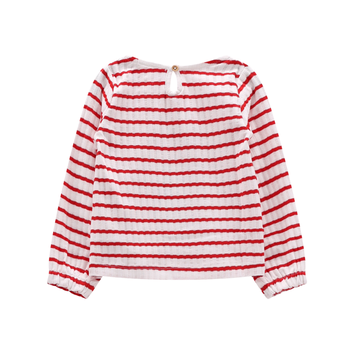 Maglia a maniche lunghe per bambina, realizzata in tinto filo 100% cotone a righe. Molto vezzosi i polsini arricciati e l'apertura sul retro. Simpatica decorazione frontale.