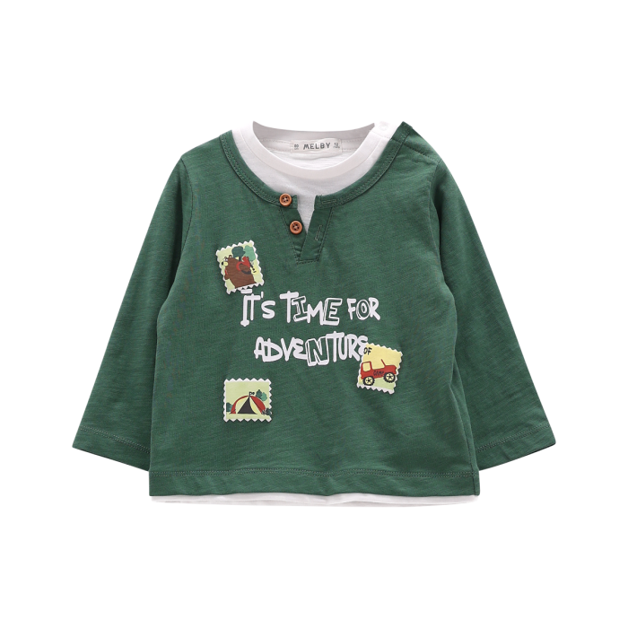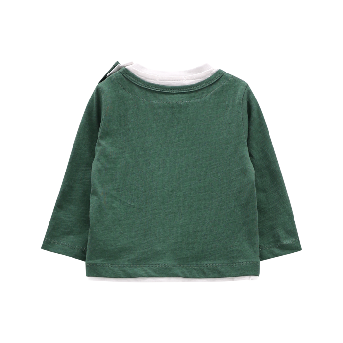 T-shirt girocollo a maniche lunghe per neonato, con effetto 2 capi in 1 sovrapposti. Tinta unita con simpatica stampa frontale, lavorazione in costina sul collo. Perfetta per la scuola!
