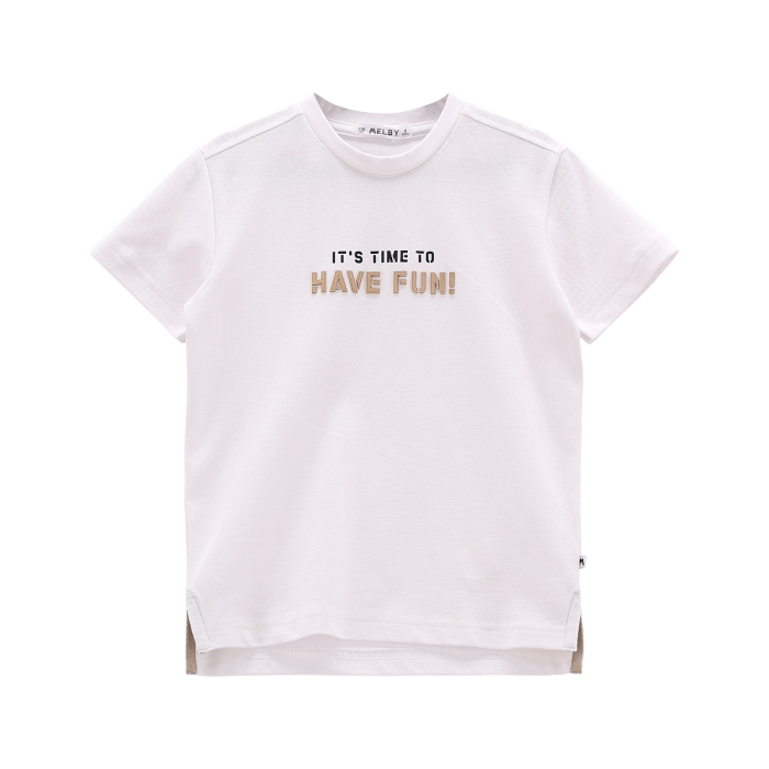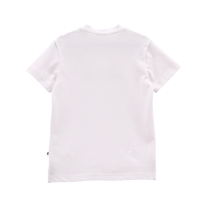 T-shirt girocollo a maniche corte per ragazzo, realizzata in piquet 100% cotone tinta unita. Spacchetti laterali con fettuccia in contrasto di colore, stampe frontali. Un capo basico e sempre versatile!