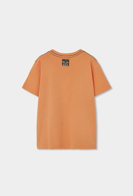 Maglietta in maglia arancione per bambino, perfetta per la stagione primaverile ed estiva. Realizzata in cotone, offre comfort e morbidezza al tatto. Presenta una divertente stampa di animali e vegetazione, ideale per i piccoli esploratori. Il suo design a maniche corte e collo rotondo la rende ideale per abbinare con jeans o pantaloncini.