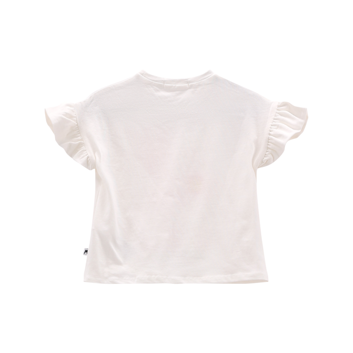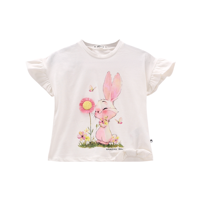 T-shirt girocollo a maniche corte per neonata, realizzata in jersey stretch tinta unita con tenera stampa frontale. Molto vezzosi il nodino sul fondo e le ruches sul giro manica.