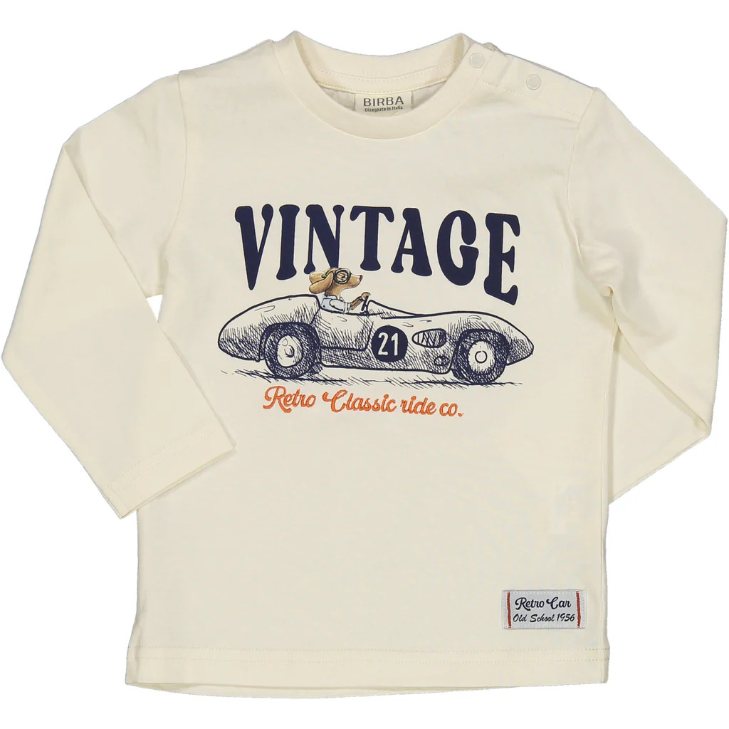 TSHIRT IN JERSEY DI COTONE. GRAFICA STAMPA AUTO D'EPOCA E DETTAGLI RICAMATI. ETICHETTA PERSONALIZZATA PER DAVANTI