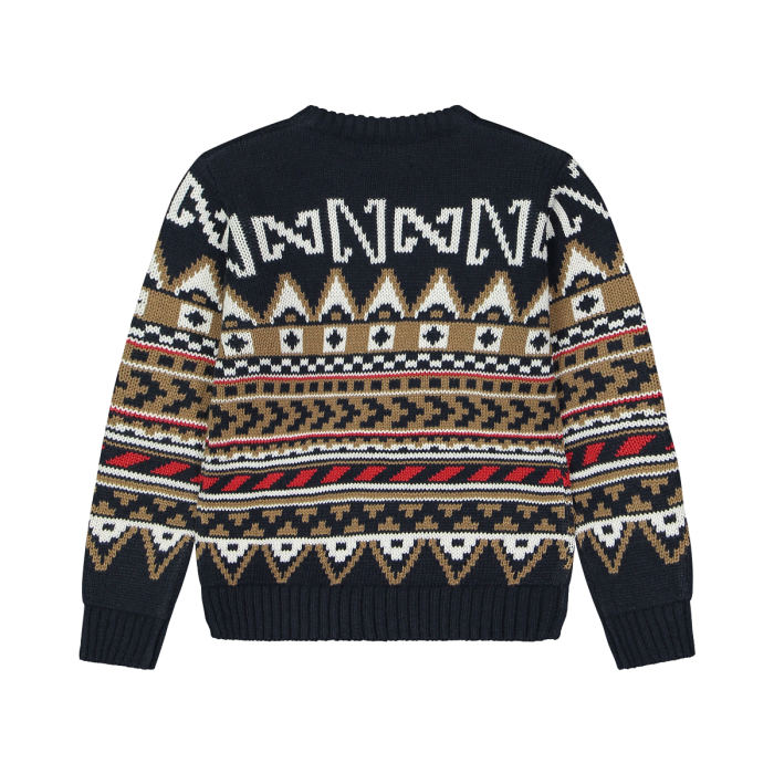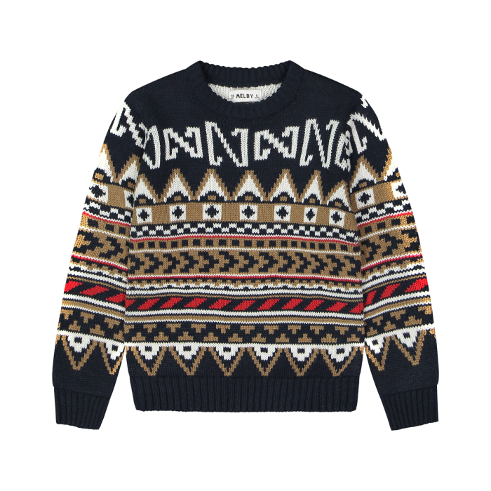 Maglia girocollo realizzato in morbido filato dalla mano calda con disegno geometrico dai colori caldi su fondo blu. Ideale per le occasioni speciali o per un look casual.