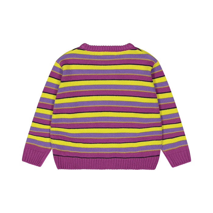 Maglione in tricot con righe colorate ciclamino, lilla e giallo brillante. Girocollo, collo e cintura rifiniti in costina abbinata. Perfetto per rendere un look invernale colorato ed allegro.