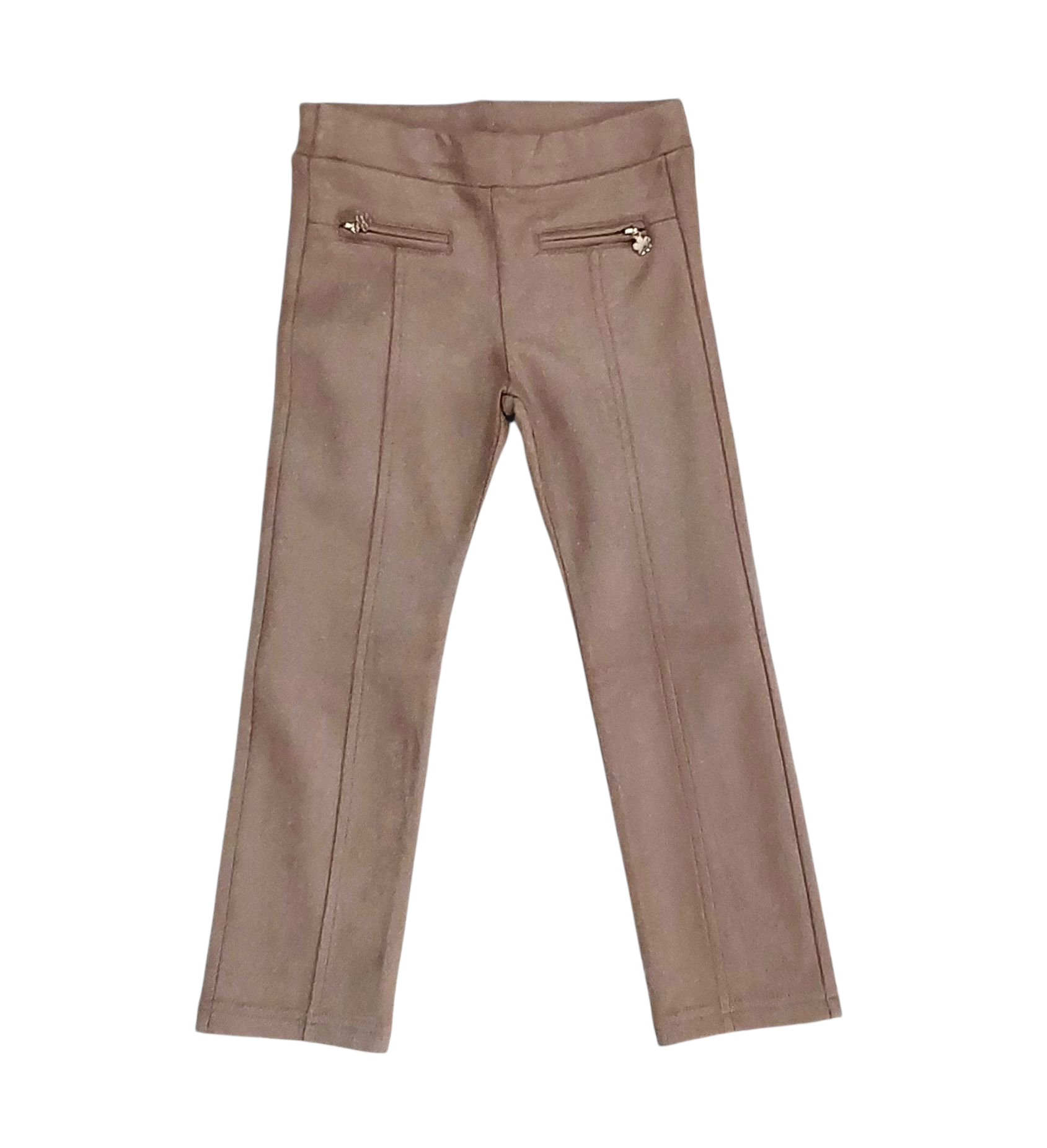 Pantaloni beige a gamba stretta con elastico in vita e finte taschine con piccole  cerniere decorative.