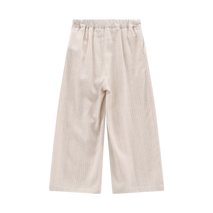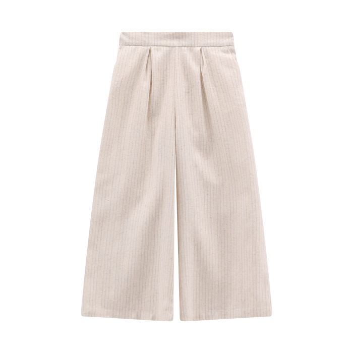 Pantalone lungo taglio palazzo per ragazza, realizzato in lino tinta unita con elegante motivo a righe. Le pieghe frontali danno volume e contemporaneità al capo, formale e sbarazzino. Vita elasticizzata con bottone in tono colore.