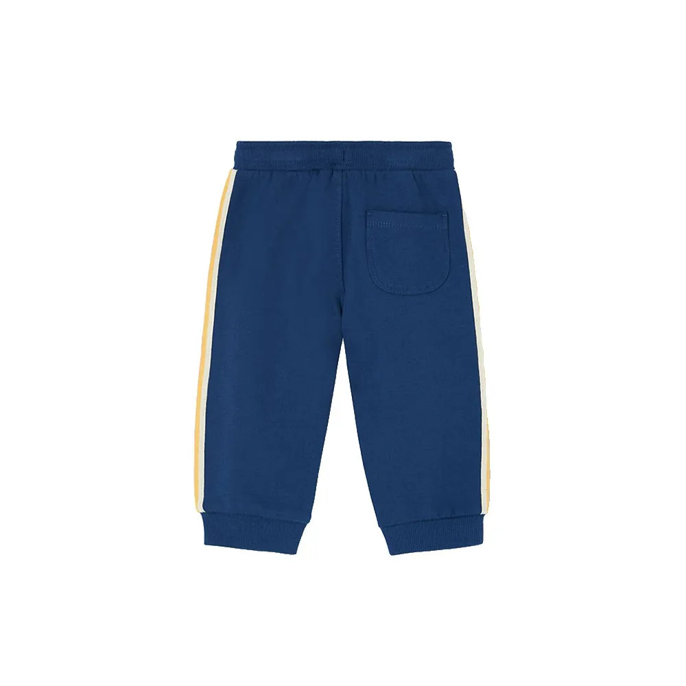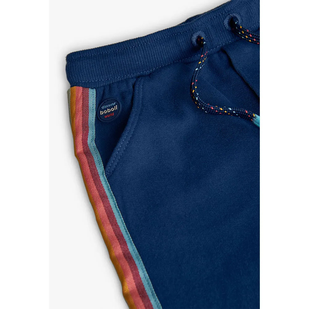 Pantaloni in pile blu da bambino con strisce laterali, ideali per le stagioni autunnale e invernale.