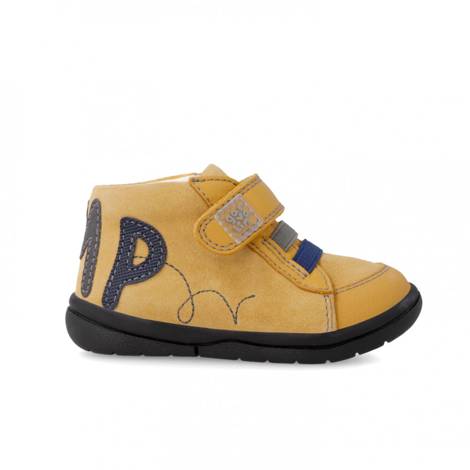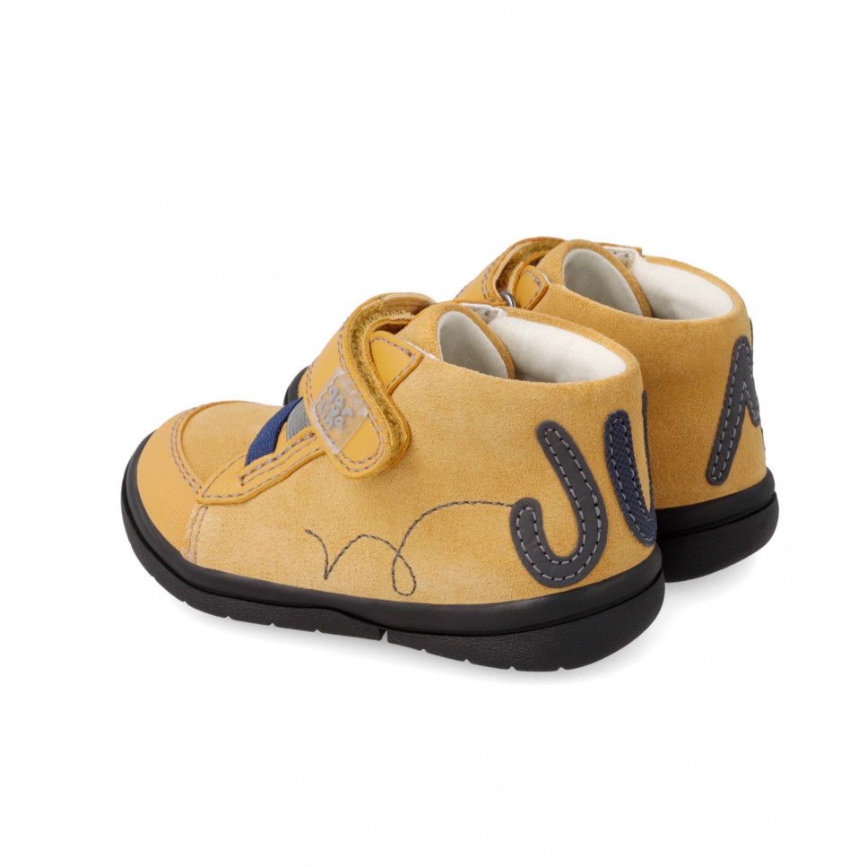 SCARPA PRIMI PASSI PER BAMBINO GIALLO CON PARTICOLARI BLU IN PELLE