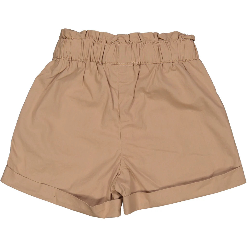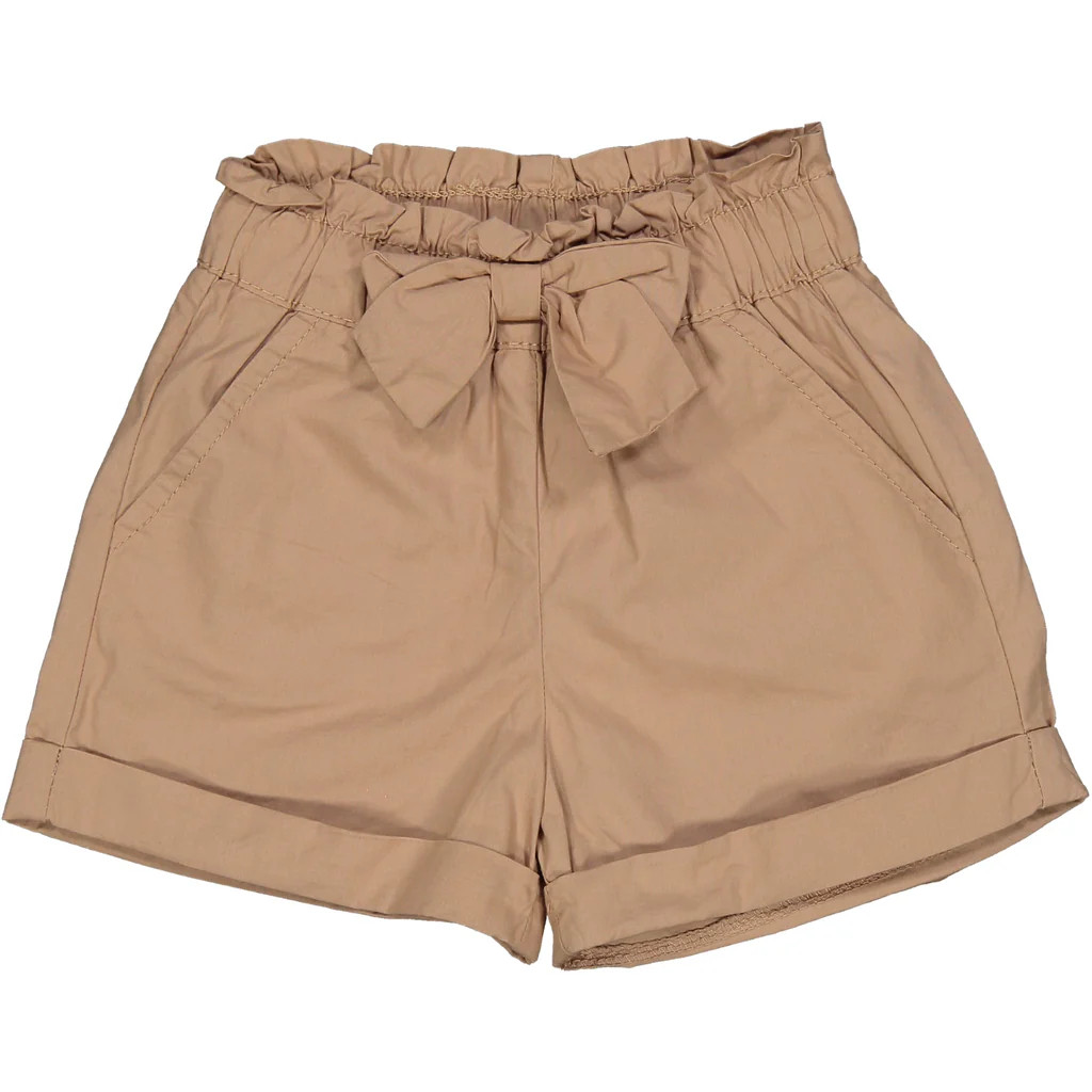 SHORT IN TESSUTO DI COTONE CON RISVOLTI FONDO GAMBA E FIOCCO MAXI APPLICATO DAVANTI. VITA ELASTICATA CON MOTIVO ROUCHE.