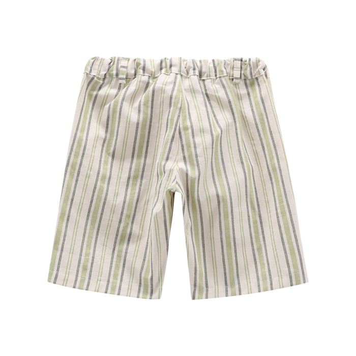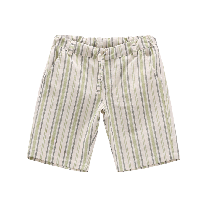 Bermuda per bambino, realizzato in cotone/lino con raffinato motivo a righe. Vita elasticizzata con coulisse interna in tono colore e passanti. Tasche alla francese. Un capo basico ma molto versatile!