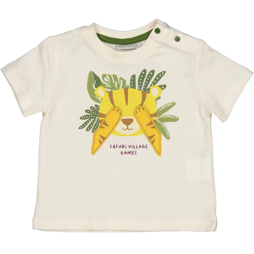 TSHIRT IN JERSEY DI COTONE. PRATICA APERTURA SU SPALLA CON BOTTONCINI AUTOMATICI. STAMPA TIGROTTO SUL DAVANTI CON ZAMPETTE RICAMATE
